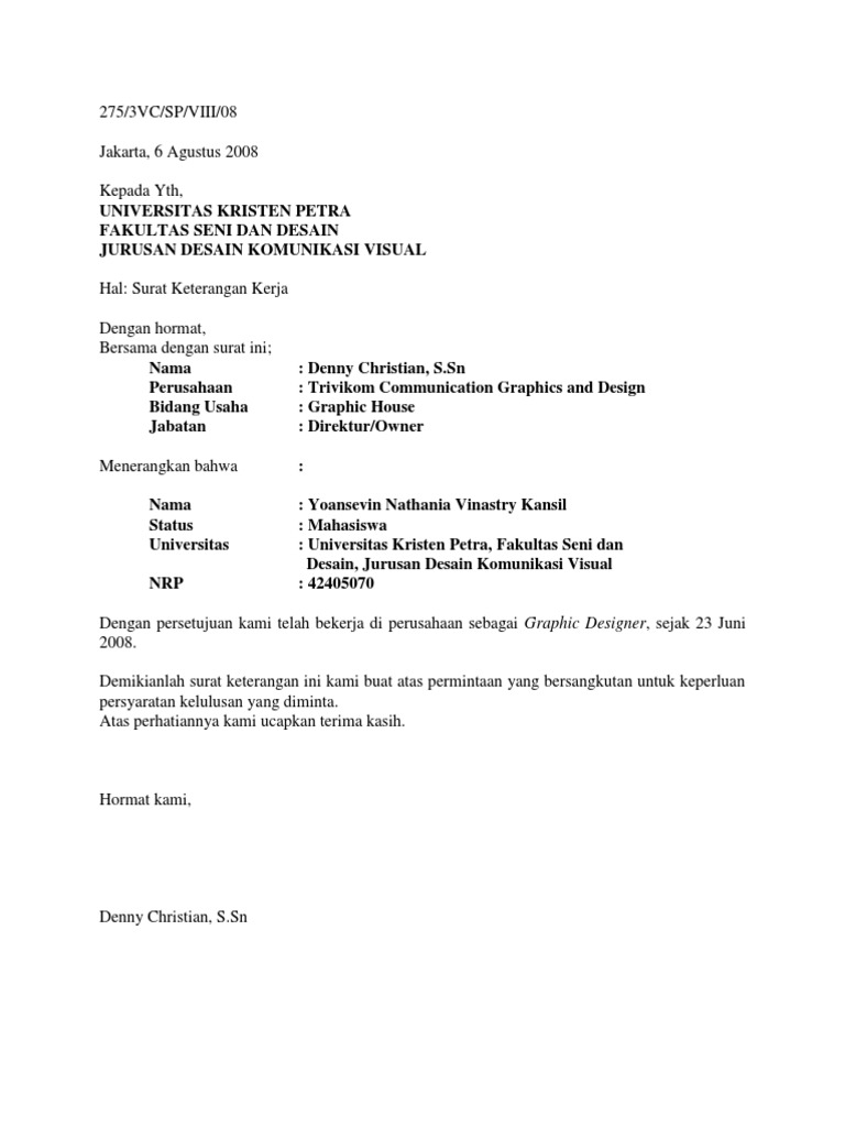 Surat keterangan kerja biasanya terdiri dari kop surat, nama dan alamat perusahaan, nama dan identitas diri karyawan, keterangan kerja atau pengalaman. Surat balasan komplain dibuat dengan tujuan untuk memberikan nilai kepada konsumen bahwa perusahaan memberikan perhatian dan. Balasan surat permohonan praktek kerja lapangan kepada : Contoh surat resmi tentang pengiriman mahasiswa magang. Contoh surat, surat penarikanfull description.